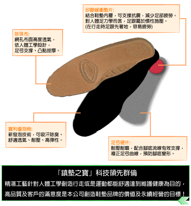 材質皆為上選,多元多層設計,耐穿透氣、專利除臭、舒適柔軟,內層設有彈性矽膠,對腳跟著力點能有效抗震,減少足部酸痛,製造過程嚴謹、品質優良,是人生保健最重要的利器。